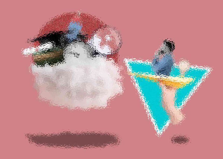 Abstract art, collage with female portrait and mountains, generative ai